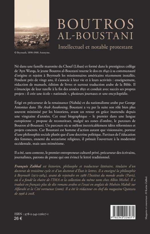 Né dans une famille maronite du Chouf (Liban) et formé dans le collège de 'Ayn Warqa, le jeune Boutros al-Boustani tourne le dos en 1840 à sa communauté d'origine et rejoint à Beyrouth les missionnaires américains dont il se séparera vingt ans plus tard. Érigé en précurseur de la renaissance (Nahda) et du nationalisme arabe par George Antonius dans The Arab Awakening, Boustani a vu par la suite son rôle bien plus souvent minimisé par les historiens, avant un retour en grâce inattendu depuis une vingtaine d'années. Cet essai biographique - le premier dans une langue européenne - propose de reconstituer, malgré ses zones d'ombre, le parcours de Boutros al-Boustani, parcours où se mêlent inextricablement idées réformistes et projets concrets. Car Boustani est homme d'action autant que visionnaire, porteur d'une philosophie sociale plutôt que d'une doctrine politique.