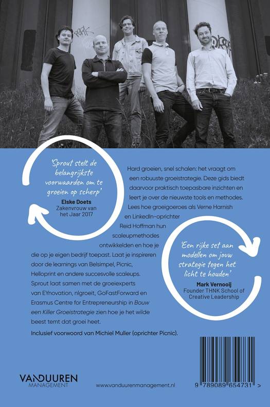 Gefeliciteerd met je succesvolle startup. En nu wordt het tijd op de mouwen echt op te stropen: ondernemers die serieuze impact willen maken, zetten alles op alles om op te schalen na die eerste mooie klanten, een zescijferige omzet en werknemer nummer 25. Welkom in het land der scaleups. Het land waarin voortdurende groei alles continu op zijn kop zet. Zorgt dat de processen van vandaag morgen kunnen vastlopen en de mijlpalen waar je zo lang van had gedroomd, pijlsnel verdwijnen in je achteruitkijkspiegel. Hard groeien, snel schalen: het vraagt om een robuuste groeistrategie. De makers van Sprout verklaren met Bouw een Killer Groeistrategie de essentie van het scaleup-ondernemen. Ze onderzochten welke wetenschappelijke inzichten en methodes ondernemers kunnen helpen bij hun eigen groeiambities. Ze leggen uit hoe groeigoeroes als Verne Harnish en LinkedIn-oprichter Reid Hoffman hun scaleupmethodes ontwikkelden en hoe je die op je eigen bedrijf kunt toepassen. Zo biedt deze groeigids ondernemers praktische handvatten om hun businessmodel aan te scherpen, te zorgen voor een state of the art marketingstrategie en financieel management dat voorkomt dat hun bedrijf kapot groeit door gebrek aan cash. De oprichters van Bloomon, Picnic en 3D Hubs vertellen in Bouw een Killer Groeistrategie hoe zij het doen: het wilde beest temmen dat groei heet. - Voor alle ondernemers die willen schalen op basis van de laatste inzichten, met de nieuwste tools en methodes. - Met learnings van de oprichters van o.a. Bloomon, Picnic en 3D Hubs. - Boordevol tips van experts op het gebied van strategie, hr, cash management en executie. De groeigids-serie wordt mede mogelijk gemaakt dankzij de kennis en ervaring van NLGroeit, Erasmus Centre for Entrepreneurship, GoFastForward en EY Innovation.