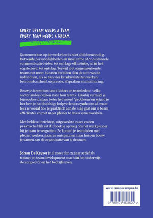 Every dream needs a team. Every team needs a dream. Samenwerken op de werkvloer is niet altijd eenvoudig. Botsende persoonlijkheden en moeizame of onbestaande communicatie leiden tot een lage efficiëntie, en in het ergste geval tot ontslag. Terwijl vlot samenwerkende teams net meer kunnen bereiken dan de som van de individuen, als ze aan vier kernkwaliteiten werken: betrouwbaarheid, expressie, afspraken en monitoring. Bouw je dreamteam leert leiders en teamleden in elke sector anders kijken naar hun teams. Daarbij vermijd je bijvoorbeeld maar beter het woord 'probleem' en schud je het best je hardnekkige hulpverlenerssyndroom af, maar leer je vooral hoe je praktisch aan de slag gaat om je team efficiënter en met meer plezier te laten samenwerken. Met heldere inzichten, uitgewerkte cases en een praktische blik zet dit boek je op weg om het werkplezier bij je team te vergroten. Zo komen je teamleden met plezier werken, gaan ze ontspannen naar huis en bouw je samen aan de organisatie van je dromen.