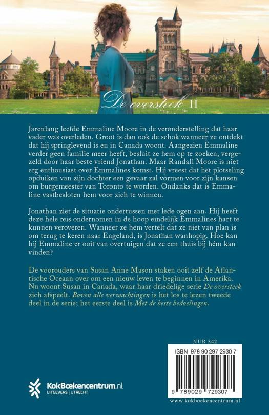 'Boven alle verwachtingen' van Susan Anne Mason neemt je mee op reis met Emmaline Moore. Jarenlang leefde zij in de veronderstelling dat haar vader was overleden. Groot is dan ook de schok wanneer ze ontdekt dat hij springlevend is en in Canada woont. Aangezien Emmaline verder geen familie meer heeft, besluit ze hem op te zoeken, vergezeld door haar beste vriend Jonathan. Hoewel haar vader niet erg toeschietelijk lijkt, is Emmaline vastbesloten om hem voor zich te winnen. Jonathan ziet het met lede ogen aan. Hoe kan hij haar er ooit van overtuigen dat ze een thuis bij hém kan vinden?