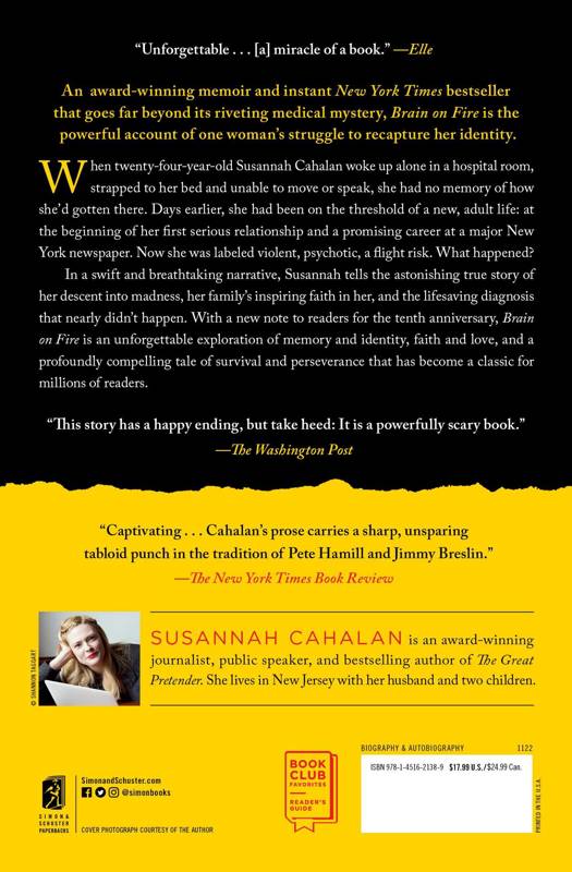 An anniversary edition of the award-winning memoir and instant New York Times bestseller that goes far beyond its riveting medical mystery, Brain on Fire is the powerful account of one woman's struggle to recapture her identity--with a new note to readers by the author. When twenty-four-year-old Susannah Cahalan woke up alone in a hospital room, strapped to her bed and unable to move or speak, she had no memory of how she'd gotten there. Days earlier, she had been on the threshold of a new, adult life: at the beginning of her first serious relationship and a promising career at a major New York newspaper. Now she was labeled violent, psychotic, a flight risk. What happened?