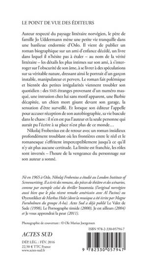 Auteur respecté du paysage littéraire norvégien, le père de famille Jo Uddermann mène une petite vie tranquille dans une banlieue endormie d'Oslo. Il vient de publier un roman biographique sur un ami d'enfance décédé, un livre dans lequel il n'hésite pas à étaler - au nom de la vérité littéraire - les détails les plus intimes sur son ami, à s'interroger sur l'obscurité de son âme, à se livrer à des spéculations sur sa véritable nature, dressant ainsi le portrait d'un garçon instable, manipulateur et pervers. Le roman fait polémique et bientôt des petites irrégularités viennent troubler son quotidien : des SMS étranges provenant d'un numéro masqué, une intrusion chez lui sans motif apparent, une Barbie décapitée, un chien mort gisant devant son garage, la sensation d'être surveillé. Et lorsque son éditeur l'appelle pour accuser réception de son autobiographie, sa vie bascule dans le chaos : il n'en est pas l'auteur et la seule personne qui aurait pu l'écrire à sa place n'est plus de ce monde...