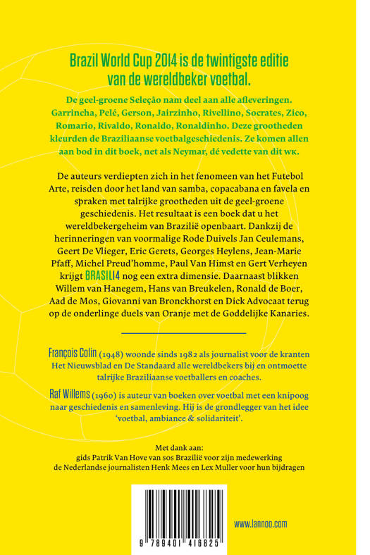 Brazil World Cup 2014 is de twintigste editie van de wereldbeker voetbal De geel-groene Seleção nam deel aan alle afleveringen. Garrincha, Pelé, Gerson, Jairzinho, Rivellino, Socrates, Zico, Romario, Rivaldo, Ronaldo, Ronaldinho. Deze grootheden kleurden de Braziliaanse voetbalgeschiedenis. Ze komen allen aan bod in dit boek, net als Neymar, dé vedette van dit WK. De auteurs verdiepten zich in het fenomeen van het Futebol Arte, reisden door het land van samba, copacabana en favela en spraken met talrijke grootheden uit de geel-groene geschiedenis. Het resultaat is een boek dat u het wereldbekergeheim van Brazilië openbaart. Dankzij de herinneringen van voormalige Rode Duivels Jan Ceulemans, Geert De Vlieger, Eric Gerets, Georges Heylens, Jean-Marie Pfaff , Michel Preud'homme, Paul Van Himst en Gert Verheyen krijgt BRASIL14 nog een extra dimensie. Daarnaast blikken Willem van Hanegem, Hans van Breukelen, Ronald de Boer, Aad de Mos, Giovanni van Bronckhorst en Dick Advocaat terug op de onderlinge duels van Oranje met de Goddelijke Kanaries.