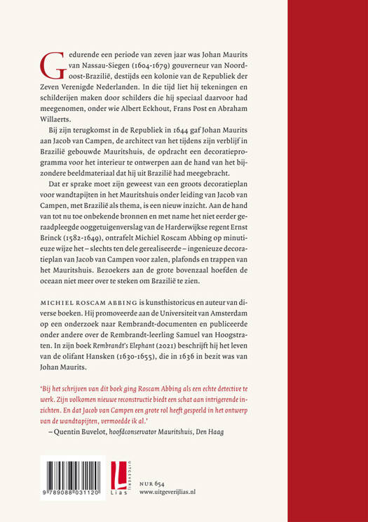 Dat er sprake moet zijn geweest van een groots decoratieplan voor wandtapijten in het Mauritshuis onder leiding van Jacob van Campen, met Brazilië als thema, is een nieuw inzicht. Aan de hand van tot nu toe onbekende bronnen en met name het niet eerder geraadpleegde ooggetuigenverslag van de Harderwijkse regent Ernst Brinck (1582-1649), ontrafelt Michiel Roscam Abbing op minutieuze wijze het - slechts ten dele gerealiseerde - ingenieuze decoratieplan van Jacob van Campen voor zalen, plafonds en trappen van het Mauritshuis. Bezoekers aan de grote bovenzaal hoefden de oceaan niet meer over te steken om Brazilië te zien.