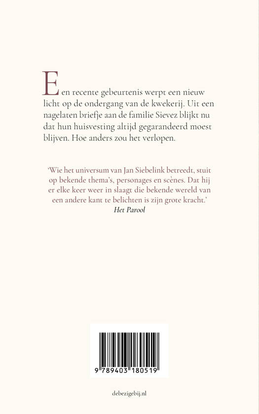 In Knielen op een bed violen vertelde de jonge Ruben Sievez het verhaal over de ondergang van het familiebedrijf. In die grote beroemde roman is het geloof van de vader de oorzaak van de teloorgang. Een recente gebeurtenis werpt echter een ander licht op de geschiedenis. Uit een nagelaten briefje van de vroeg gestorven huurbaas van destijds blijkt nu pas dat de huisvesting van de bewoners van de kwekerij altijd gegarandeerd zou moeten blijven. Hoe anders is het verlopen. Brengschuld vertelt het verhaal van hoe geldgebrek de kwekersfamilie noopte een deel van hun grond te verkopen. Door de bouw van een grote tennishal aan de rand van hun overgebleven terrein komt de wereld binnen. Het paradijs raakt verstoord en de ondergang van de kwekerij is aanstaande. In het oeuvre van Jan Siebelink is er een constant decor, maar steeds worden de gebeurtenissen anders beschreven, met een andere bestemming van de personages, vanuit een ander perspectief. Het ritueel van de terugkerende elementen openbaart niet alleen de kern van zijn familie, maar brengt tegelijk het schrijverschap van Jan Siebelink vol aan het licht.