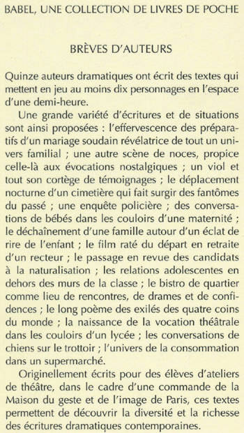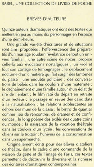 Quinze auteurs dramatiques ont écrit des textes qui mettent en jeu au moins dix personnages en l'espace d'une demi-heure. Une grande variété d'écritures et de situations sont ainsi proposées : l'effervescence des préparatifs d'un mariage soudain révélatrice de tout un univers familial ; une autre scène de noces, propice celle-là aux évocations nostalgiques ; un viol et tout son cortège de témoignages ; le déplacement nocturne d'un cimetière qui fait surgir des fantômes du passé ; une enquête policière ; des conversations de bébés dans les couloirs d'une maternité ; le déchaînement d'une famille autour d'un éclat de rire de l'enfant ; le film raté du départ en retraite d'un recteur ; le passage en revue des candidats à la naturalisation ; les relations adolescentes en dehors des murs de la classe ; le bistro de quartier comme lieu de rencontres, de drames et de confidences ; le long poème des exilés des quatre coins du monde ; la naissance de la vocation théâtrale dans les couloirs d'un lycée ; les conversations de chiens sur le trottoir ; l'univers de la consommation dans un supermarché. Originellement écrits pour des élèves d'ateliers de théâtre, dans le cadre d'une commande de la Maison du geste et de l'image de Paris, ces textes permettent de découvrir la diversité et la richesse des écritures dramatiques contemporaines.