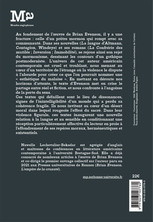 Au fondement de l’œuvre de Brian Evenson, il y a une fracture : celle d’un prêtre mormon qui rompt avec sa communauté. Dans ses nouvelles (La langue d’Altmann, Contagion, Windeye) et ses romans (La Confrérie des mutilés ; Inversion ; Immobilité), se rejoue ainsi son rejet du mormonisme, dessinant les contours d’un gothique postmoderniste. L’univers de cet auteur américain contemporain est cruel et troublant, nous menant au cœur d’un territoire de l’étrange où la violence le dispute à l’absurde pour créer ce que l’on pourrait nommer une « esthétique du malaise ». En mettant en déroute nos horizons d’attente, le texte d’Evenson met en crise le partage entre réel et fiction, et nous confronte à l’angoisse de la perte du sens.
