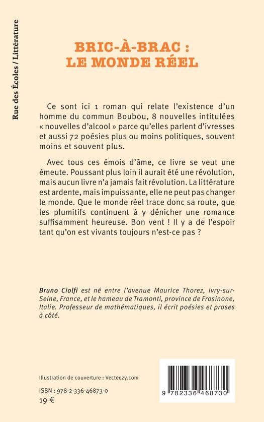 Ce sont ici 1 roman qui relate l’existence d’un homme du commun Boubou, 8 nouvelles intitulées « nouvelles d’alcool » parce qu’elles parlent d’ivresses et aussi 72 poésies plus ou moins politiques, souvent moins et souvent plus. Avec tous ces émois d’âme, ce livre se veut une émeute. Poussant plus loin il aurait été une révolution, mais aucun livre n’a jamais fait révolution. La littérature est ardente, mais impuissante, elle ne peut pas changer le monde. Que le monde réel trace donc sa route, que les plumitifs continuent à y dénicher une romance suffisamment heureuse. Bon vent ! Il y a de l’espoir tant qu’on est vivants toujours n’est-ce pas ?