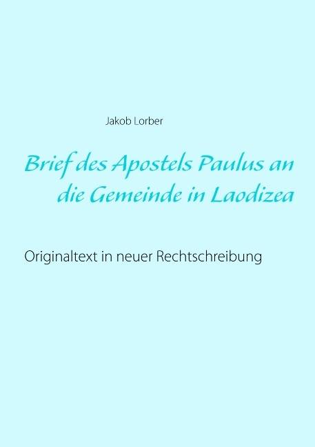 Im verschollenen und durch Jakob Lorber neu geoffenbarten Laodizenerbrief ruft der Apostel Paulus die ersten Christen in einem leidenschaftlichen Appell auf, keine der durch Christus überwundenen Dinge des Judentums und Heidentums, wie den Tempelbau, eine pharisäerhafte Priesterschaft, Kultgewänder und Zeremonien, Feiertage, Beschneidung und Reinheitsgebote zu übernehmen. Aus dem Inhalt wird ersichtlich, warum dieser Paulus-Brief den Gläubigen vorenthalten wurde, aber immer noch aktuell und wichtig ist.