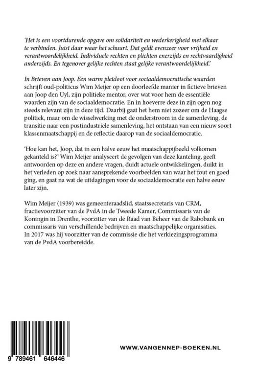 In 'Brieven aan Joop. Een warm pleidooi voor sociaal-democratische waarden' schrijft oud-politicus Wim Meijer op een toegankelijke manier in fictieve brieven aan Joop den Uyl, zijn politieke mentor, over wat voor hem de essentiële waarden zijn van de sociaaldemocratie. En in hoeverre deze nog steeds relevant zijn in deze tijd. Daarbij gaat het hem niet zozeer om de Haagse politiek, maar om de wisselwerking tussen de onderstroom in de samenleving, de transitie naar een postindustriële samenleving, het ontstaan van een nieuw soort klassenmaatschappij en de reflectie daarop van de sociaaldemocratie.