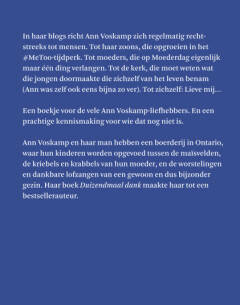 In haar blogs richt Ann Voskamp zich regelmatig rechtstreeks tot mensen. Tot haar zoons, die opgroeien in het #MeToo-tijdperk. Tot moeders, die op Moederdag eigenlijk maar één ding verlangen. Tot de kerk, die moet weten wat die jongen doormaakte die zichzelf van het leven benam (Ann was zelf ook al eens bijna zo ver). Tot zichzelf: Lieve mij…