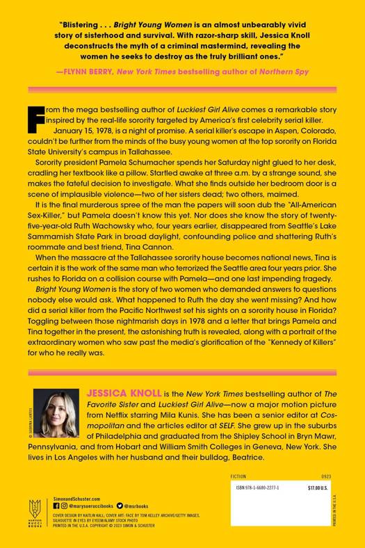 Blisteringly paced, Bright Young Women is “Jessica Knoll at her best—an unflinching and evocative novel about the tabloid fascination with evil and the dynamic and brilliant women who have the real stories to tell” (Laura Dave, New York Times bestselling author of The Last Thing He Told Me); and “a compelling, almost hypnotic read and I loved it with a passion” (Lisa Jewell, New York Times bestselling author of None of This Is True).