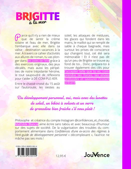 Parce qu’il n’y a rien de mieux que de sentir la crème solaire et l’eau de mer, Brigitte t’embarque avec elle dans sa valise : destination vacances à la mer. À travers ce cahier d’activités aux allures de roman, tu vas plonger dans les joies de l’été grâce à des exercices originaux, des jeux décalés, mais aussi les péripéties de notre trépidante héroïne, le tout saupoudré de réflexions pour t’aider à DÉ-COM-PLE-XER. Entre le chassé-croisé du 15 août sur l’autoroute, les siestes au soleil, les attaques de méduses, les glaces qui fondent dans les mains, le maillot qui se remplit de sable à chaque baignade, mais surtout les prises de conscience qui changent tout, cet été sera mémorable ! Et il n’est pas dit qu’un peu de Brigitte se trouve au fond de toi… Donc, prépare-toi à trouver également des clés pour t’accepter telle que tu es, comprendre tes forces, tes envies profondes et savourer l’instant présent. Du développement personnel, oui, mais avec des lunettes de soleil, un bikini à volants et un verre de grenadine bien fraîche s’il vous plaît !