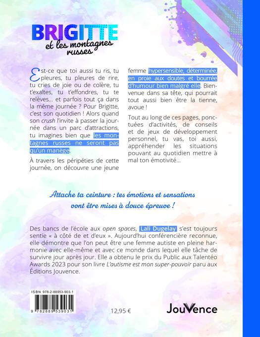 Est-ce que toi aussi tu ris, tu pleures, tu pleures de rire, tu cries de joie ou de colère, tu t’exaltes, tu t’effondres, tu te relèves… et parfois tout ça dans la même journée ? Pour Brigitte, c’est son quotidien ! Alors quand son crush l’invite à passer la journée dans un parc d’attractions, tu imagines bien que les montagnes russes ne seront pas qu’un manège. À travers les péripéties de cette journée, on découvre une jeune femme hypersensible, déterminée, en proie aux doutes et bourrée d’humour bien malgré elle. Bienvenue dans sa tête, qui pourrait tout aussi bien être la tienne, avoue ! Tout au long de ces pages, ponctuées d’activités, de conseils et de jeux de développement personnel, tu vas, toi aussi, appréhender les situations pouvant au quotidien mettre à mal ton émotivité… Attache ta ceinture : tes émotions et sensations vont être mises à douce épreuve !
