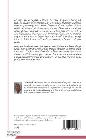 Le voici qui entre dans l'atelier. En coup de vent. Chacun est prêt. Le maître salue chacun sans le nommer. Il adresse quelques mots au personnage venu poser, s'inquiète de son confort. Puis il vérifie les épreuves dessinées préparatoires. Nous sommes présents dans l'atelier, chargés de la couleur noire tout juste liée, au milieu de l'effervescence silencieuse qui accompagne toujours ces instants magiques où le maître s'assied face à son modèle qui n'a pas bougé d'un cil. C'est à nous qu'il s'adresse soudain : « Le noir, s'il vous plaît ! »