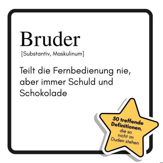 Wer glaubt, Brüder seien nur nervig, hat "Bruder: Teilt die Fernbedienung nie, aber immer Schuld und Schokolade" noch nicht gelesen! Hier wird das Chaos, das nur ein Bruder ins Leben bringen kann, in 50 witzigen Definitionen und Illustrationen gefeiert - von der legendären Fernbedienungsschlacht bis zum geheimen Schokoladenversteck.Für wen dieses Buch perfekt ist:- Für alle, die mit einem Bruder aufgewachsen sind (und es überlebt haben)- Für Eltern, die das tägliche Bruder-Drama mit Humor nehmen wollen- Für alle, die nach einem originellen Geschenk für Geschwister suchenOb Stinkbomben, Taschengeldkredite oder die ewige Frage nach dem W-LAN-Passwort - dieses Buch hält den Spiegel vor und sorgt für Lacher bei jedem, der das Bruderleben kennt. Ein Muss für alle, die wissen, dass Brüder zwar nie die Fernbedienung teilen, aber immer Schuld und Schokolade.Was dieses Buch bietet:- 50 humorvolle Definitionen rund ums Bruder-Sein- Passende, witzige Illustrationen zu jedem Thema- Perfekt als Geschenk für Brüder und Geschwister- Ein liebevoller Blick auf das Chaos und die Magie der Bruderbeziehung