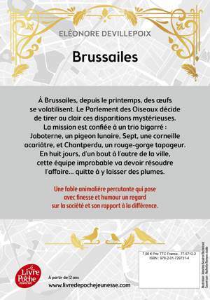 À Brussailes, depuis le printemps, des œufs se volatilisent. Le Parlement des Oiseaux décide de tirer au clair ces disparitions mystérieuses. La mission est confiée à un trio bigarré : Jaboterne, un pigeon lunaire, Sept, une corneille acariâtre, et Chantperdu, un rouge-gorge tapageur. En huit jours, d'un bout à l'autre de la ville, cette équipe improbable va devoir résoudre l’affaire… quitte à y laisser des plumes.