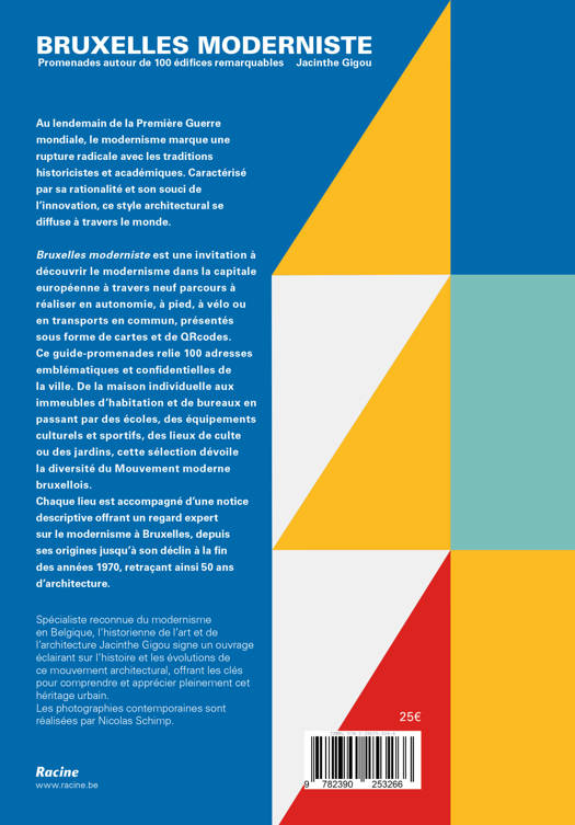 Bruxelles moderniste est une invitation à découvrir le modernisme dans la capitale européenne à travers neuf parcours à réaliser en autonomie, à pied, à vélo ou en transports en commun, présentés sous forme de cartes et de QRcodes. Ce guide-promenades relie 100 adresses emblématiques et confidentielles de la ville. De la maison individuelle aux immeubles d'habitation et de bureaux en passant par des écoles, des équipements culturels et sportifs, des lieux de culte ou des jardins, cette sélection dévoile la diversité du Mouvement moderne bruxellois.