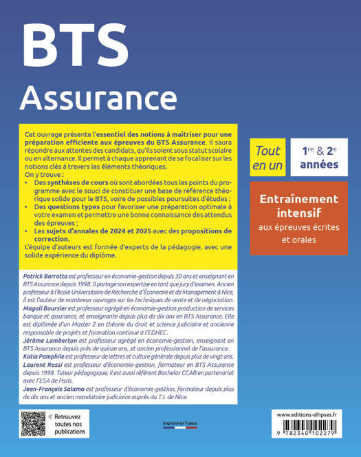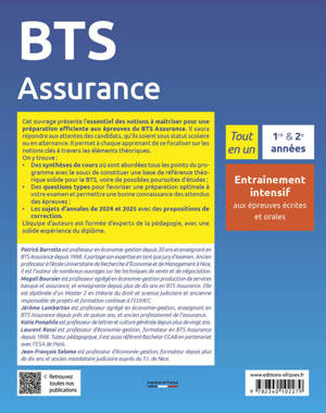 Cet ouvrage présente l’essentiel des notions à maitriser pour une préparation efficiente aux épreuves du BTS Assurance. Il saura répondre aux attentes des candidats, qu’ils soient sous statut scolaire ou en alternance. Il permet à chaque apprenant de se focaliser sur les notions clés à travers les éléments théoriques.
