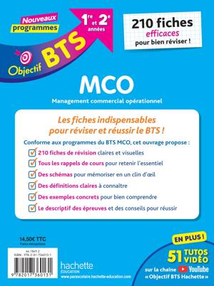 Conforme aux nouveaux programmes, cet ouvrage sous forme de fiches a été conçu pour vous accompagner tout au long des deux années de BTS Management Commercial Opérationnel : - 210 fiches de révision claires et visuelles - Tous les rappels de cours, pour retenir l’essentiel - Des schémas, pour mémoriser en un clin d’œil - Des définitions claires à connaître - Des exemples concrets pour bien comprendre - Le descriptif des épreuves et des conseils pour réussir.