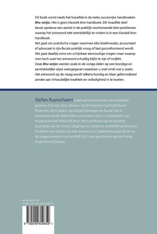 Dit boek vormt reeds het twaalfde in de reeks succesrijke handboeken Btw-eetjes. Het is geen klassiek btw-handboek. Dit twaalfde deel bevat opnieuw een aantal in de praktijk voorkomende btw-problemen waarop het antwoord niet onmiddellijk te vinden is in een klassiek btw-handboek. Het gaat om praktische vragen waarmee elke boekhouder, accountant of advocaat in zijn fiscale praktijk vroeg of laat geconfronteerd wordt. Het gaat daarbij soms om schijnbaar eenvoudige vragen maar waarop men toch vaak het antwoord schuldig blijkt te zijn of twijfelt. Deze Btw-eetjes werden zoals in de vorige delen op een bondige en aantrekkelijke wijze weergegeven waardoor u snel vindt wat u zoekt. Het antwoord op de vraag wordt telkens bondig en klaar geformuleerd zonder aan inhoudelijke kwaliteit en volledigheid in te boeten.
