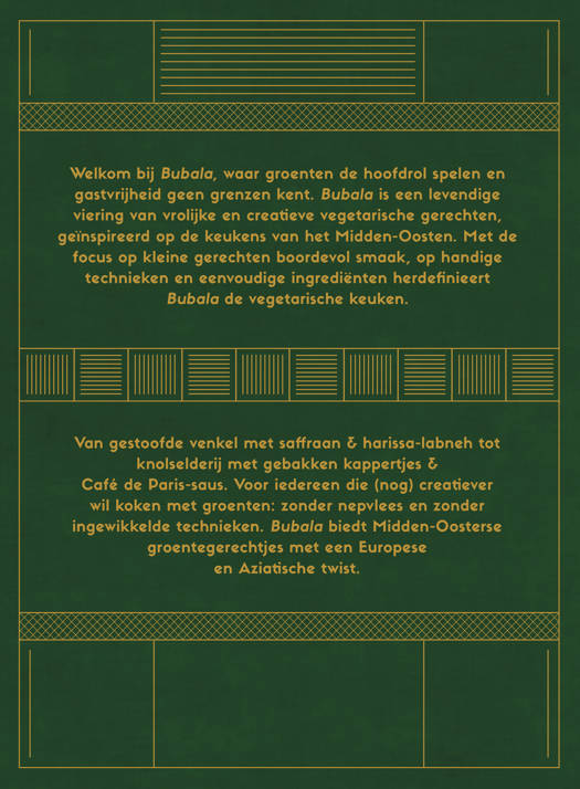 Van gestoofde venkel met saffraan & harissa-labneh tot knolselderij met gebakken kappertjes & Café de Paris-saus. Voor iedereen die (nog) creatiever wil koken met groenten: zonder nepvlees en zonder ingewikkelde technieken. Bubala biedt Midden-Oosterse groentegerechtjes met een Europese en Aziatische twist.