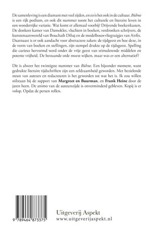 De samenleving is een diamant met veel zijden, en zo is het ook in de cultuur. Bühne is een rijk podium, en ook dit nummer toont het culturele en literaire leven in een wonderrijke variatie. Wat komt er allemaal voorbij? Drijvende boekenkasten, De donkere kamer van Damokles, vluchten in boeken, verdronken schrijvers, de kunstenaarswereld van Bouchaib Dihaj en de modelbouwvliegtuigjes van Airfix. Daarnaast is er ook aandacht voor abstractere zaken: de tijdgeest en hoe deze, in de vorm van boeken en stellingen, zijn stempel drukte op de tijdsgeest. Spelling die curieus hervormd werd onder de vrije geest van stimulerende middelen en potente vrijheid. De bestaande orde moest wijken, maar was er een alternatief?