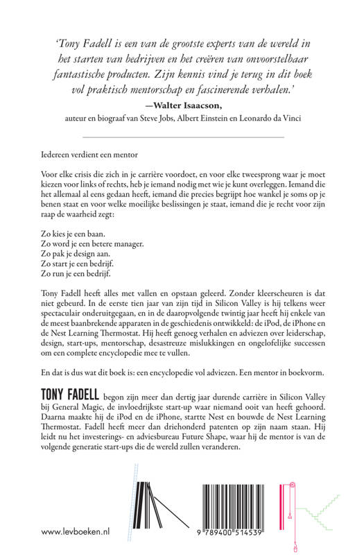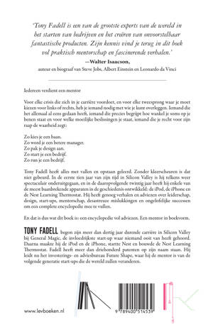 Tony Fadell leidde de teams die de iPod, iPhone en Nest Learning Thermostat hebben gemaakt. In meer dan 30 jaar in Silicon Valley heeft hij genoeg geleerd over leiderschap, design, startups, Apple, Google, besluitvorming, mentorschap, verwoestende mislukkingen en ongelooflijk succes om een encyclopedie te vullen.