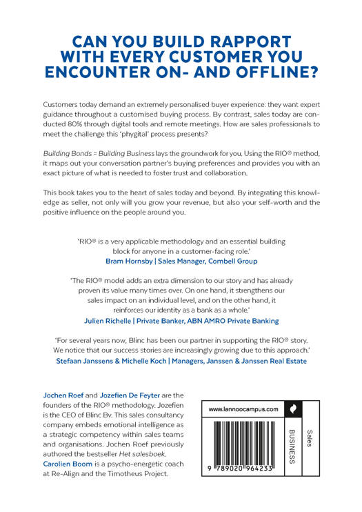 Building Bonds = Building Business lays the groundwork for you. Using the RIO® method, it maps out your conversation partner's buying preferences and provides you with an exact picture of what is needed to foster trust and collaboration.