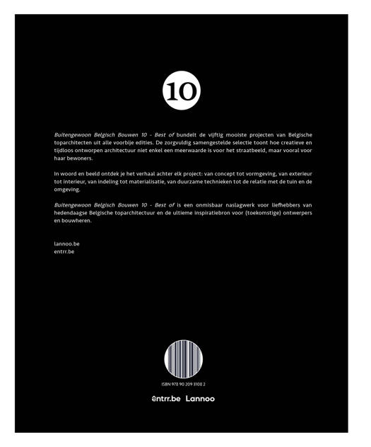 Buitengewoon Belgisch Bouwen 10 - Best of is een onmisbaar naslagwerk voor liefhebbers van hedendaagse Belgische toparchitectuur en de ultieme inspiratiebron voor (toekomstige) ontwerpers en bouwheren.
