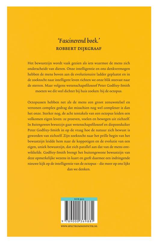 Octopussen hebben net als de mens een groot zenuwstelsel en vertonen complex gedrag dat misschien nog wel complexer is dan het onze. Sterker nog, de acht tentakels van een octopus leiden een volkomen eigen leven: ze proeven, voelen en bewegen uit zichzelf. In Buitengewoon bewustzijn gaat wetenschapsfilosoof en diepzeeduiker Peter Godfrey-Smith in op de vraag hoe de natuur zich bewust is geworden van zichzelf. Zijn zoektocht naar het prille begin van het bewustzijn leidde hem naar de koppotigen en de evolutie van een eigen, uniek bewustzijn, dat zich parallel aan dat van de mens ontwikkelde. Godfrey-Smith brengt het buitengewone bewustzijn van deze opmerkelijke wezens in kaart en geeft daarmee een indringende nieuwe kijk op de intelligentie van de octopus – die meer op ons lijkt dan we denken.