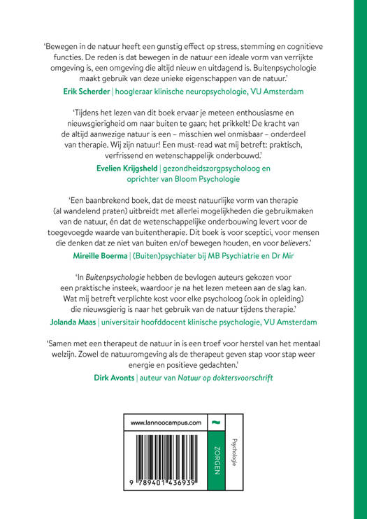 Buitenpsychologie laat zien hoe de natuur een wetenschappelijk bewezen bijdrage kan leveren aan therapie. Met inspirerende casussen, onderzoek en praktische handvatten bespreekt dit boek de drie pijlers van Buitenpsychologie: de rol van de therapeut, het belang van beweging en de kracht van de natuur. Van CGT en ACT tot EMDR en schematherapie; veel methoden werken buiten net zo goed en vaak zelfs beter.
