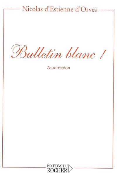Nicolas d'Estienne d'Orves pèse 68,88 kg sans noeud papillon et n'aime pas l'autofiction. Comme c'est un garçon paradoxal, il ne parle que de lui dans Bulletin Blanc ! À sa manière, allusive, insolente et drôle. Quand il raconte sa journée, il revoit, réentend sa vie. La voix de Fernandel dans la Volvo paternelle, les lettres d'une charmante hystérique au pensionnat, un hommage à Jean-Pierre Mocky, une séance de cinéma porno au milieu des clodos. Ce n'est pas sordide, c'est humain, trop humain. Parfois élégiaque, comme ces vues de Paris. Souvent éclairant, comme ces considérations sur l'art musical et littéraire. D'Estienne d'Orves a aussi un coeur, mais il faut s'approcher de lui, le lire entre les lignes, pour l'entendre battre. Voici l'autoportrait d'un mauvais garçon du siècle, atteint d'" insensibilité créative ", qui défend l'outrance, l'imagination et le " devoir d'amnésie ". Ce bréviaire fera grincer les dents cariées, d'autres l'ouvriront comme une " boîte aux trésors " pleine de secrets et de surprises.