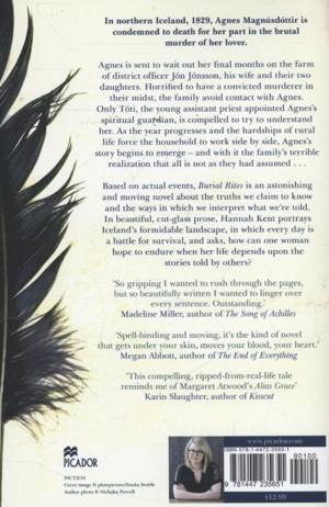 They said I must die. They said that I stole the breaths from men, and now they must steal mine. I imagine, then, that we are all candle flames, greasy-bright, fluttering in the darkness and the howl of the wind, and in the stillness of the room I hear footsteps, awful coming footsteps, coming to blow me out and send my life up away from me in a grey wreath of smoke. In northern Iceland, 1829, Agnes Magnusdottir is condemned to death for her part in the brutal murder of her lover. Agnes is sent to wait out her final months on the farm of district office Jon Jonsson, his wife and their two daughters. Horrified to have a convicted murderer in their midst, the family avoid contact with Agnes. Only Toti, the young assistant priest appointed Agnes's spiritual guardian, is compelled to try to understand her. As the year progresses and the hardships of rural life force the household to work side by side, Agnes' story begins to emerge and with it the family's terrible realization that all is not as they had assumed. Based on actual events, Burial Rites is an astonishing and moving novel about the truths we claim to know and the ways in which we interpret what we're told. In beautiful, cut-glass prose, Hannah Kent portrays Iceland's formidable landscape, in which every day is a battle for survival, and asks, how can one woman hope to endure when her life depends upon the stories told by others?
