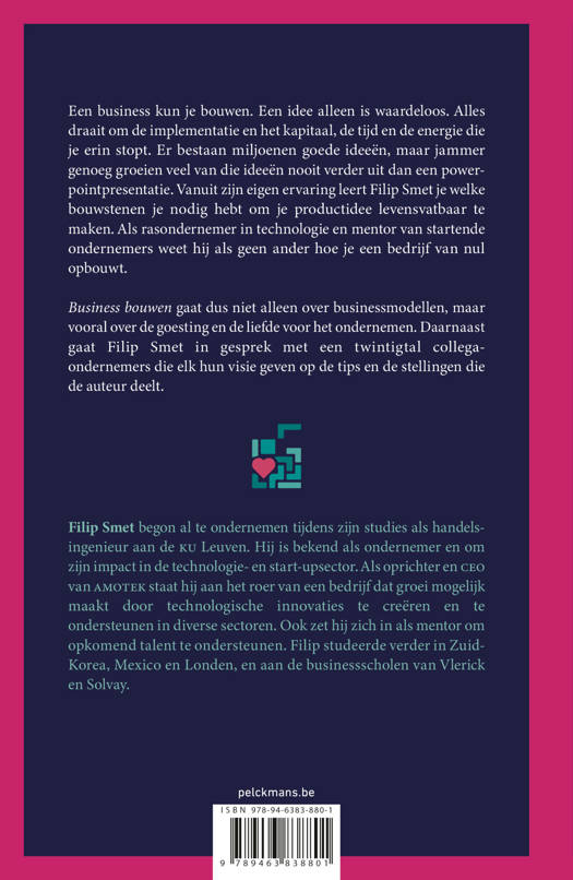 Een business kun je bouwen. Een idee alleen is waardeloos. Alles draait om de implementatie en het kapitaal, de tijd en de energie die je erin stopt. Er bestaan miljoenen goede ideeën, maar jammer genoeg groeien veel van die ideeën nooit verder uit dan een powerpointpresentatie. Vanuit zijn eigen ervaring leert Filip Smet je welke bouwstenen je nodig hebt om je productidee levensvatbaar te maken. Als rasondernemer in technologie en mentor van startende ondernemers weet hij als geen ander hoe je een bedrijf van nul opbouwt.