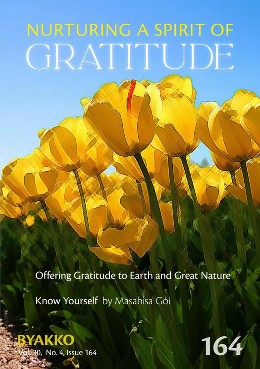 Issue 164 focuses on nurturing gratitude within ourselves. In "Offering Gratitude to Earth and Great Nature", Yuka, Maki, and Rika Saionji lead participants in prayers of gratitude and a reading from Masahisa Goi. More writings by Masahisa Goi, including "How I Became the Person I Am Now" and "Know Yourself", expand on the theme of gratitude. Also features part 2 of "Happiness and Unhappiness" by Masami Saionji and the first chapter from "Essays on the Bible, Vol. 2" by Masahisa Goi, as well as reports from overseas events.