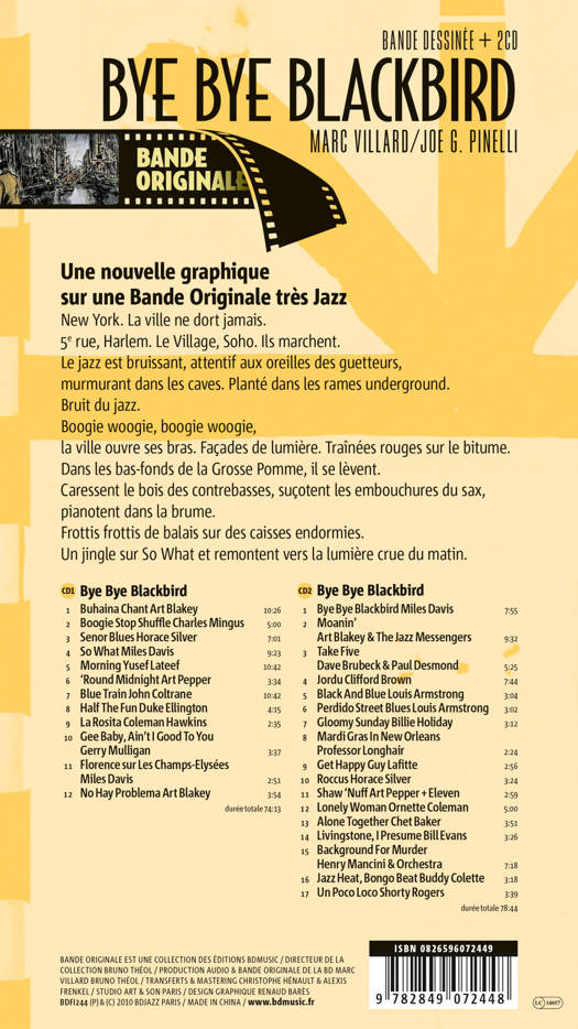 Bye Bye Blackbird ou Le jour où le jazz est devenu moderne. Un récit graphique écrit par Marc Villard, illustré par Joe G. Pinelli, accompagné de 2 compact discs du jazz qui bascule dans le monde moderne entre 1957 et 1962.<br /> New York. La ville ne dort jamais. 5ème rue, Harlem. Le Village, Soho. Ils marchent. Le jazz est bruissant, attentif aux oreilles des guetteurs, murmurant dans les caves. Planté dans les rames underground. Bruit du jazz. Boogie Woogie, Boogie Woogie, la ville ouvre ses bras. Façades de lumière. Traînées rouges sur le bitume. Dans les bas-fonds de la Grosse Pomme, ils se lèvent. Caressent le bois des contrebasses, suçotent les embouchures du sax, pianotent dans la brume. Frottis frottis de balais sur des caisses endormies. Un jingle sur So What et remontent vers la lumière crue du matin. Sur des scènes éphémères, des aliens dévastés: les tordus du bleu. Se donnent. Joes’pub. Patricia, les doigts en éventail. Loin, très loin de Chicago. Une voix de rupture. Les mains s’anamorphosent et, au black, l’inframonde retient son souffle.<br /><br /> TRACK LIST <br /> CD 1 Bye Bye Blackbird<br /><br /> 1 Buhaina Chant Art Blakey 10:26<br /> 2 Boogie Stop Shuffle Charles Mingus 5:00 <br /> 3 Senor Blues Horace Silver 7:01 <br /> 4 So What Miles Davis 9:23<br /> 5 Morning Yusef Lateef 10:42 <br /> 6 'Round Midnight Art Pepper 3:34 <br /> 7 Blue Train John Coltrane 10:42 <br /> 8 Half The Fun Duke Ellington 4:15<br /> 9 La Rosita Coleman Hawkins 2:35 <br /> 10 Gee Baby, Ain't I Good To You Gerry Mulligan 3:37 <br /> 11 Florence Sur Les Champs-Elysées Miles Davis 2:51<br /> 12 No Hay Problema Art Blakey 3:54<br /> Durée totale 74:13<br /><br /> CD 2 Bye Bye Blackbird<br /><br /> 1 Bye Bye Blackbird Miles Davis 7:55 <br /> 2 Moanin' Art Blakey & The Jazz Messengers 9:32<br /> 3 Take Five Dave Brubeck & Paul Desmond 5:25<br /> 4 Jordu Clifford Brown 7:44<br /> 5 Black And Blue Louis Armstrong 3:04 <br /> 6 Perdido Street Blues L.ouis Armstrong 3:02<br /> 7 Gloomy Sunday Billie Holiday 3:12<br /> 8 Mardi Gras In New Orleans Professor Longhair 2:24<br /> 9 Get Happy Guy Lafitte 2:56<br /> 10 Roccus Horace silver 3:24 <br /> 11 Shaw 'Nuff Art Pepper + Eleven 2:59 <br /> 12 Lonely Woman Ornette Coleman 5:00 <br /> 13 Alone Together Chet Baker 3:51<br /> 14 Livingstone, I Presume Bill Evans 3:26 <br /> 15 Background For Murder Henry Mancini & Orchestra 7:18 <br /> 16 Jazz Heat, Bongo Beat Buddy Colette 3:18 <br /> 17 Un Poco Loco Shorty Rogers 3:40 <br /> Durée Totale 78:44<br /><br />