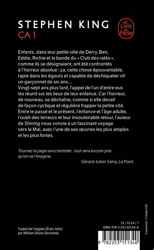 Enfants, dans leur petite ville de Derry, Ben, Eddie, Richie et la petite bande du « Club des ratés », comme ils se désignaient, ont été confrontés à l'horreur absolue: ça, cette chose épouvantable, tapie dans les égouts et capable de déchiqueter vif un garçonnet de six ans... Vingt-sept ans plus tard, l'appel de l'un d'entre eux les réunit sur les lieux de leur enfance. Car l'horreur, de nouveau, se déchaîne, comme si elle devait de façon cyclique et régulière frapper la petite cité. Entre le passé et le présent, l'enfance et l'âge adulte, l'oubli des terreurs et leur insoutenable retour, l'auteur de Sac d'os nous convie à un fascinant voyage vers le Mal, avec une de ses oeuvres les plus amples et les plus fortes.