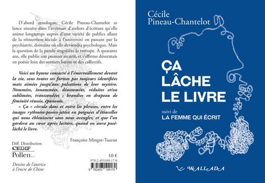 Un hymne tendrement consacré à l’émerveillement devant la vie, sous toutes ses formes pas toujours identifiées mais aimées jusqu’au coeur de leur mystère. Nommées, innommées, dénommées, réduites et/ou sublimées, transcendées , brandies en drapeau de féminité réussie, épanouie. « Ça » circule dans et entre les phrases, entre les images rythmées-posées-jetées en poignées d’étincelles qui nous éblouissent sans nous aveugler, et que l’on gardera au coeur après lecture, quand on aura posé-lâché le livre. Le parcours de l'autrice est singulier : Après quelques campagnes de vendanges en tant qu’oenologue et la mise au monde de ses enfants, Cécile Pineau-Chantelot se lance dans l’aventure des ateliers d’écriture. Elle sera longtemps animatrice auprès d’une variété de publics allant de la réinsertion sociale à l’université, en passant par la psychiatrie, son désir étant de proposer à tous un espace d’expression singulière. Elle publiera en revue, à cette occasion, plusieurs articles. Puis la nécessité du livre se fait plus pressante. À quarante ans, elle autoédite son premier recueil, Corpus40. Mais la question de la parole singulière la rattrape. Elle devient alors psychologue dans le secteur de la psychiatrie. Quant à l'écriture, c’est désormais loin des groupes qu’elle la mène. Son travail poétique sera récompensé par le Prix Vargaftig 2019 avec son recueil Domestique édité chez Jacques Brémond. Elle publie ici aux Editions Wallâda son troisième ouvrage.