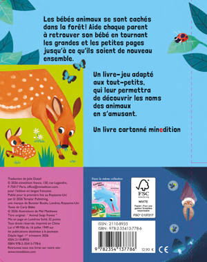 Les bébés animaux se sont cachés dans la forêt ! L’enfant lecteur aide chaque animal à retrouver son bébé en tournant les grandes et les petites pages jusqu’à ce qu’ils soient de nouveau ensemble. Un livre-jeu adapté aux tout-petits qui leur permettra de découvrir les noms des animaux en s’amusant.