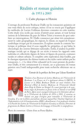 Cet ouvrage est une vraie thèse de socio-critique et tout lecteur curieux de la littérature du pays de Sékou Touré y trouvera de quoi satisfaire ses interrogations. M. Diallo commence par situer très minutieusement le cadre géographique, les régions, le climat, en regard de l'espace symbolique évoqué par les romanciers. Il explore ensuite le contexte historique et politique dont il nous rappelle les péripéties; enfin, il analyse la problématique sociale qui se dégage de ces récits à travers les rapports entre individus et collectivité.