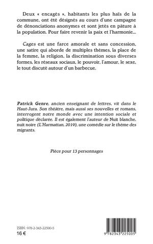 Deux encagés, habitants les plus haïs de la commune, ont été désignés au cours d'une campagne de dénonciations anonymes et sont jetés en pâture à la population. Pour faire revenir la paix et l'harmonie... Cages est une farce amorale et sans concession, une satire qui aborde de multiples thèmes, la place de la femme, la religion, la discrimination sous diverses formes, les réseaux sociaux, le pouvoir, l'amour, le sexe, le tout discuté autour d'un barbecue.