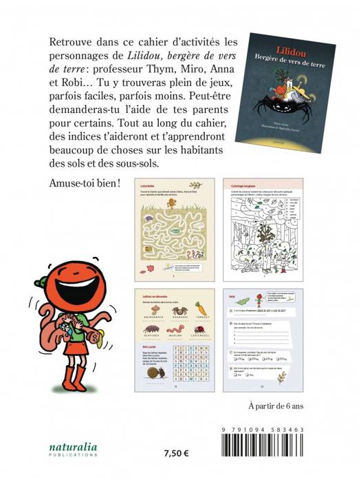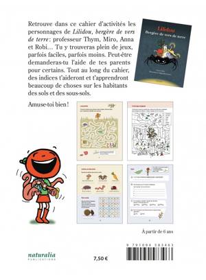 Retrouve dans ce cahier d'activités les personnages de Lilidou, bergère de vers de terre : professeur Thym, Miro, Anna et Robi... Tu y trouveras plein de jeux, parfois faciles, parfois moins. Peut-être demanderas-tu l'aide de tes parents pour certains. Tout au long du cahier, des indices t'aideront et t'apprendront beaucoup de choses sur les habitants des sols et des sous-sols. Amuse-toi bien !