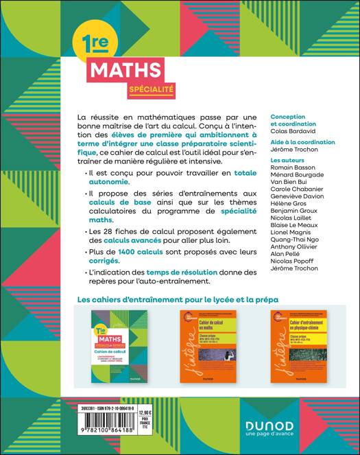 Ce cahier de calcul a été conçu par une trentaine de professeurs de mathématiques de lycée et de classes préparatoiresà l'intention des élèves de première spécialité maths pour leur permettre de s'entraîner au calcul en toute autonomie. La technique et le calcul sont fondamentaux pour appréhender les questions mathématiques. De même que l’on doit faire des gammes et beaucoup pratiquer lorsque l’on apprend un instrument, on doit calculer régulièrement lorsque l’on apprend les mathématiques, et plus particulièrement lesélèves de première qui ambitionnent d'intégrer une classe préparatoire scientifique. Ce cahier est construit sous forme de 28 fiches contenant plus de 1400 calculs qui couvrent à la fois les calculs de base et les thèmes calculatoires du programme de spécialité maths. Les exercices sont tous proposés avec leurs corrigés. Des indications de temps de résolution donnent des repères pour l'auto-entraînement.