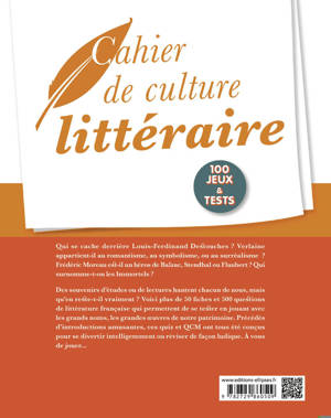 Des souvenirs d’études ou de lectures hantent chacun de nous, mais qu’en reste-t-il vraiment ? Voici plus de 50 fiches et 500 questions de littérature française qui permettent de se tester en jouant avec les grands noms, les grandes œuvres de notre patrimoine. Précédés d’introductions amusantes, ces quiz et QCM ont tous été conçus pour se divertir intelligemment ou réviser de façon ludique. À vous de jouer...