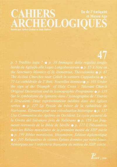 Les Cahiers archéologiques, formant des recueils d'études, publient des recherches originales sur l'art et l'archéologie des derniers siècles de l'Antiquité et du Moyen Age. Sans s'imposer un programme plus précis, ils donnent la préférence aux études consacrées aux monuments paléochrétiens et à ceux du haut Moyen Age, à l'œuvre artistique de Byzance et des chrétientés orientales, ainsi qu'aux travaux sur les origines de l'art médiéval et sur les rapports entre l'art du Bas-Empire et l'art du Moyen Age, entre l'art chrétien d'Orient et d'Occident. Les Cahiers archéologiques sont largement ouverts aux investigations archéologiques qui envisagent les documents d'art comme des témoignages sur l'histoire des idées et des croyances religieuses.