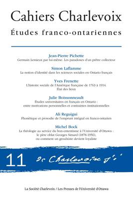Jean-Pierre Pichette présente le troisième chapitre de « Germain Lemieux par lui-même », ce qui complète la série autobiographique du célèbre ethnologue (1914-2008) qui a oeuvré en Ontario français durant plus d'un demi-siècle. Tirées de la longue entrevue accordée à l'auteur en 1995, ces ultimes confidences du père Lemieux portent sur les genres de la littérature orale - conte et chanson - qu'il a privilégiés. Simon Laflamme examine la notion d'identité telle qu'elle se révèle dans les travaux des spécialistes des sciences humaines qui se sont penchés sur l'Ontario français. Après avoir mis en évidence des théories générales puis planté quelques balises historiques, il considère les travaux selon leur domaine d'analyse : l'éducation, la politique et le juridique, le genre, la famille, les médias, les arts et les sports. Au terme de cette recension, il met en lumière les deux thèses qui polarisent le discours : l'assimilation et l'hybridité. Yves Frenette propose un tour d'horizon de l'histoire sociale de la francophonie nordaméricaine, entre le départ de la France du continent, en 1763, et la Première Guerre mondiale. Divisé en deux périodes, ce long XIXe siècle « franco-américain » voit tout à la fois l'expansion et la contraction du fait français, à la mesure, d'une part, des migrations, et, d'autre part, de l'ascendance hégémonique de la langue anglaise. Julie Boissonneault pose son regard sur la fréquentation des établissements universitaires, elle se demande dans quelle langue les Franco-Ontariens font leur scolarité. Sont alors mises en jeu la langue maternelle et la langue de la scolarité à l'élémentaire et au secondaire comme vecteurs de leur motivation à étudier en français au palier supérieur. Ali Reguigui convient que s'il existe un nombre important de recherches portant sur la phonétique et la phonologie des emprunts intégrés et sur la manière dont les mots empruntés sont ajustés et reproduits selon les schèmes phonétiques de la langue receveuse, les études scrutant le traitement phonétique et prosodique de l'emprunt intégral en franco-ontarien font défaut. Il livre ici les prémices d'une enquête préliminaire sur la prosodie de l'emprunt. Michel Bock propose une analyse de la pensée politique du père oblat Georges Simard (1878- 1956), théologien et professeur à l'Université d'Ottawa pendant la première moitié du XXe siècle. Rattaché, à l'origine, à la faction nationaliste intransigeante des oblats canadiens-français, le père Simard changea son fusil d'épaule pour épouser d'abord le « bon-ententisme », puis le loyalisme, après que Rome fut intervenue pour condamner le nationalisme catholique à la fois en Ontario français, dans le contexte de la crise du Règlement 17, et en Europe. Fidèle à la pratique établie depuis le cinquième volume des Cahiers Charlevoix, ce onzième volume se termine par la « chronique » que notre confrère Marcel Bénéteau a préparée. On y trouvera rassemblés les nouvelles et les faits saillants relatifs aux activités professionnelles des membres de la Société Charlevoix et la liste des articles publiés par les membres de la Société des Dix. Publié en français