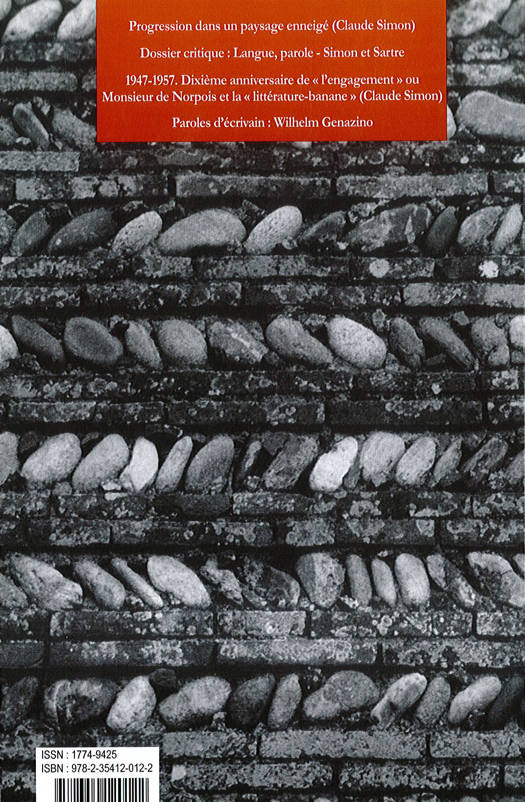 Outre des articles sur les thèmes Langue et parole, Simon et Sartre, ce numéro contient un inédit de C. Simon (Progression dans un paysage enneigé), un autre inédit contre Sartre (Monsieur de Norpois et la littérature banane), la traduction d'un texte de W. Genazino, écrivain allemand admirateur de C. Simon, et un point sur l'actualité de l'oeuvre.