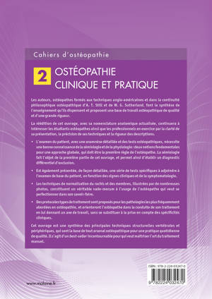 Les auteurs, ostéopathes formés aux techniques anglo-américaines et dans la continuité philosophique ostéopathique d'A. T. Still et de W. G. Sutherland, font la synthèse de l'enseignement qu'ils dispensent et proposent une base de travail ostéopathique de qualité et d'une grande rigueur. La réédition de cet ouvrage, avec sa nomenclature anatomique entièrement actualisée, continuera à intéresser les étudiants ostéopathes ainsi que les professionnels en exercice par la clarté de sa présentation, la précision de ses techniques et la rigueur des descriptions - qui en ont fait l'un des best-sellers de la profession depuis 2005. - L'examen du patient, avec une anamnèse détaillée et des tests ostéopathiques (largement décrits dans Le cahier n° 1) nécessite une bonne connaissance de la sémiologie et de la physiologie : deux notions fondamentales pour une approche globale, qui doit être la première règle de l'ostéopathe. La sémiologie fait l'objet de la première partie de cet ouvrage, et permet ainsi d'établir un diagnostic différentiel d'exclusion. - Est également présentée, de façon détaillée, une série de tests spécifiques complémentaires à adjoindre à l'examen de base du patient, en fonction des signes cliniques et de la symptomatologie. - Les techniques de normalisation du rachis et des membres, illustrées par de nombreuses photos, constituent un véritable vade-mecum aide mémoire à l'usage de l'ostéopathe qui veut se perfectionner dans son savoir-faire. - Des protocoles types de traitement sont proposés pour les pathologies les plus fréquemment abordées en ostéopathie, et orienteront l'ostéopathe dans la conduite de son traitement en lui donnant un axe de travail, sans jamais se substituer à la prise en compte des spécificités cliniques. Cet ouvrage est une synthèse des principales techniques structurelles vertébrales et périphériques, qui sont la base de tout arsenal ostéopathique pour une pratique quotidienne de qualité. Il s'agit d'un best-seller incontournable pour qui veut maîtriser l'art du traitement manuel.