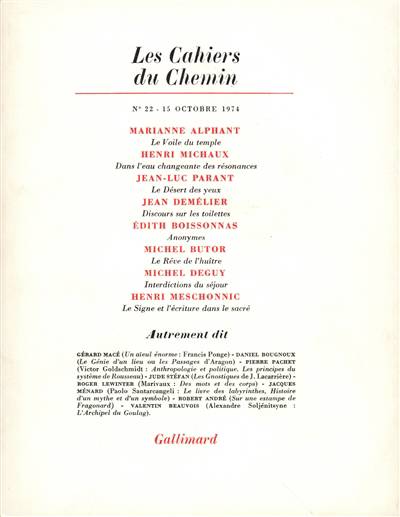 Marianne Alphant, Le voile du temple Henri Michaux, Dans l'eau changeante des résonances Jean-Luc Parant, Le désert des yeux Jean Demélier, Discours sur les toilettes Édith Boissonnas, Anonymes Michel Butor, Le rêve de l'huître Michel Deguy, Interdictions du séjour Henri Meschonnic, Le signe et l'écriture dans le sacré Gérard Macé, Francis Ponge : l'aïeul énorme Daniel Bougnoux, Aragon, ou le génie d'un lieu Pierre Pachet, Victor Goldschmidt, Anthropologie et politique. Les principes du système de Rousseau Jude Stéfan, Jacques Lacarrière, Les Gnostiques Roger Lewinter, Marivaux : des mots et des corps Jacques Ménard, Paolo Santarcangeli, Le Livre des labyrinthes. Histoire d'un mythe et d'un symbole Robert André, Sur une estampe de Fragonard Valentin Beauvois, Alexandre Soljénitsyne, L'Archipel du Goulag